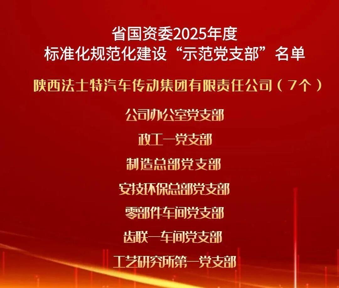 近日,陕西省国资委党委通报2025年度标准化规范化建设示范党支部名单,法士特集团公司办公室、政工一、制造总部等7个基层党支部榜上有名,荣获省国资委“示范党支部”称号。这既是对法士特集团党委深耕党建品牌建设、推进基层党组织标准化规范化建设成果的高度肯定,更彰显了企业以制度落实强化组织效能、推进党建与业务深度...