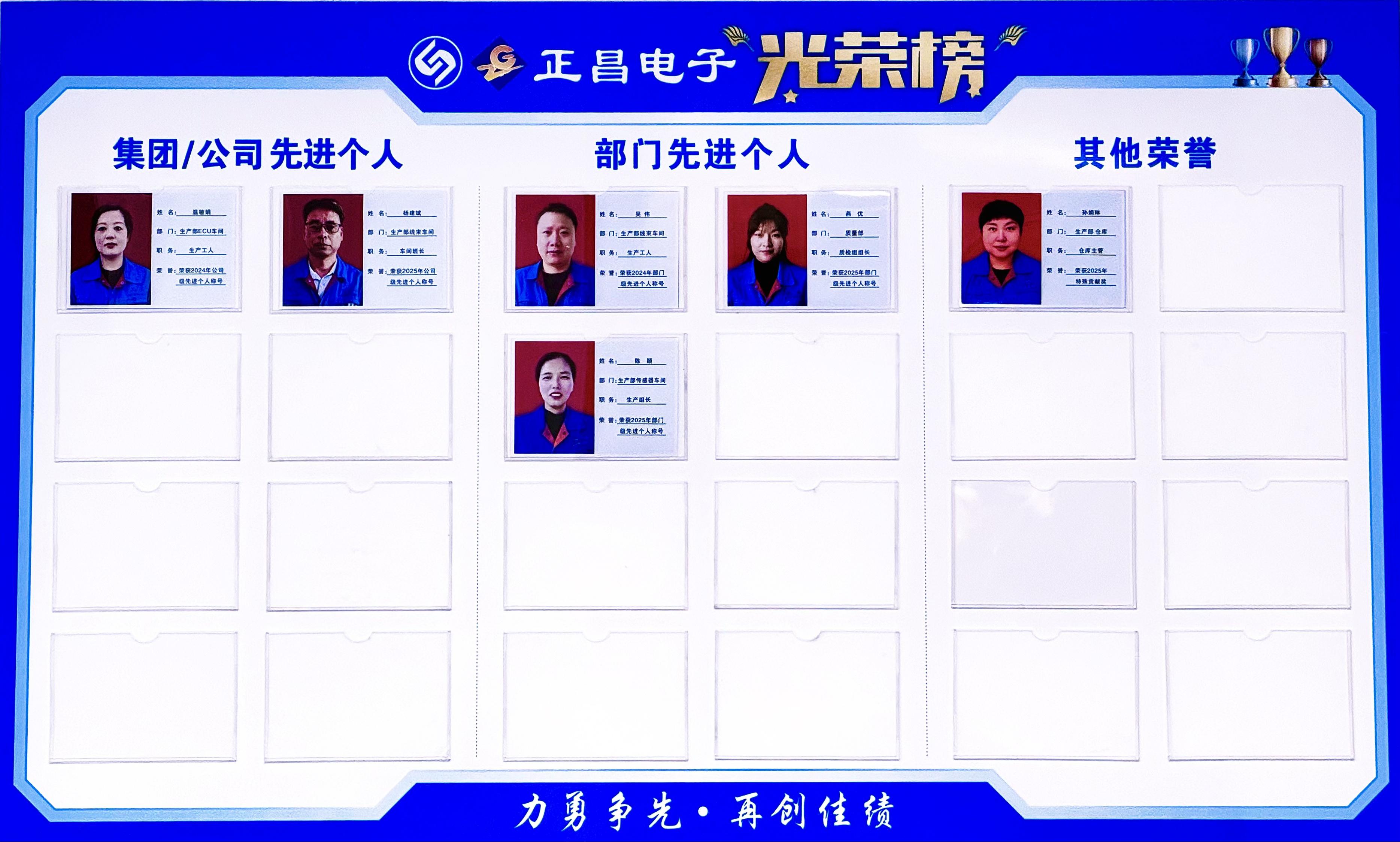 点击量:48为表彰先进、树立标杆,营造崇尚榜样、学习榜样、争当榜样的浓厚氛围,4月8日,公司在办公楼、车间、库房等共六地办公区域同步设立“正昌电子光荣榜”,集中展示荣获集团/公司先进个人、部门先进个人及各类荣誉的优秀同事风采。一面光荣榜,一份责任心,一束榜样光。榜上的每一位同事,都在各自岗位上坚守初心、履职尽责,以...